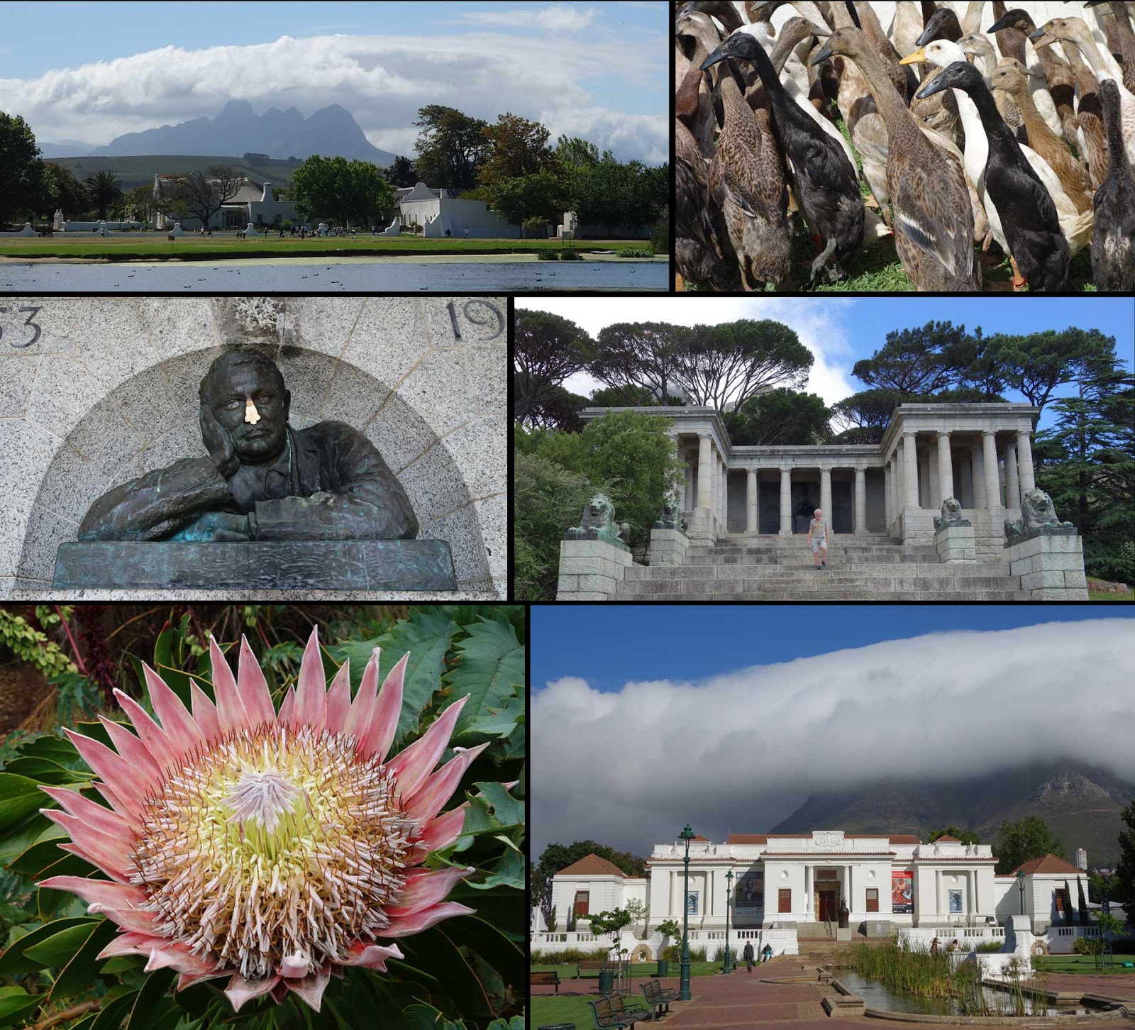 Op weg naar de Kirstenbosch Botanische Tuin zagen we een afslag naar het 'Cecil Rhodes Memorial', en dat hebben we even bezocht. Het valt mee dat er nog wegwijzers staan naar dat ding, want dit lijkt ons een monument waarmee de huidige machthebbers wel wat in hun maag zitten. Meneer Rhodes was nu niet bepaald politiek correct naar huidige maatstaven (ambitieuze kolonialist, vast overtuigd van de blanke supprematie). Maar ja, in zijn tijd geëerd om zijn bijdrage aan het tot stand brengen van Cape Town (en natuurlijk ook Rhodesie, nu Zimbabwe, dat zelfs naar hem was vernoemd). De wraak van de geschiedenis bestaat in dit geval daaruit, dat de neus van zijn bronzen standbeeld is afgezaagd, redelijk recent zo te zien, zodat een mooi glanzend oppervlak resteert als middelpunt van zijn norse kop. Daarnaast zijn er sporen van brandstichting en bekladding te zien. Verder ook een nogal fout monument, met te veel zuilen en zo, maar met een prachtig uitzicht (over de sloppen van Khayelitsha, no less...).